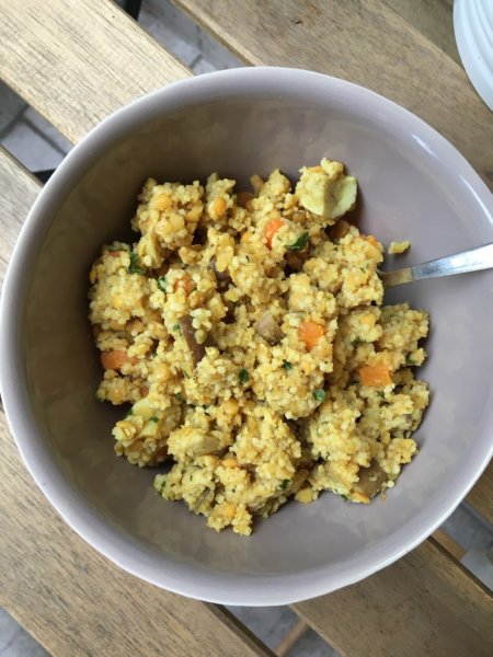 A sárgarépát apróra vágtam és nagyon kevés olajon megpirítottam. Hozzádtam az apróra vágott gombát is, majd a száraz vöröslencsét. Megfűszereztem és felöntöttem vízzel, hogy ellepje. Kb 15 perc alatt összefőztem, amikor kellett még öntöttem rá vizet, és utána fűszereztem. Majd belekevertem a száraz kuszkuszt (főzés nélkül). Alacsony lángon pár percig még főztem és kész is lettem vele ☺