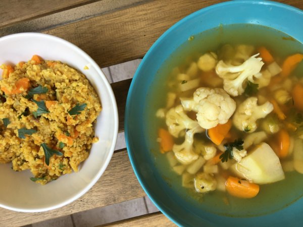 A hagyományos zöldségleves mellett készítettem egy curry-s vöröslencsés egytálétlet. Főzéskor nem igazán szoktam mérni semmit, szóval a “receptjeim” amolyan mi és mennyi van otthon stílusuak.