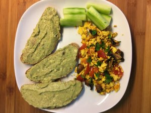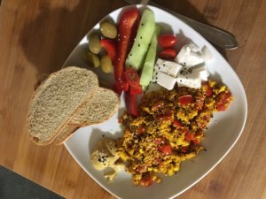 Egy kisebb hagymát apríts fel és olajon kezd el pirítani. Majd morzsolj rá fél kocka füstölt tofut, fűszerezd kurkumával és kicsit pirítsd meg. Kész is az alap “rántotta”, én ezt szoktam még gombával és/vagy aprított paradicsommal turbózni. Friss petrezselyemmel, egy nagy adag salátával, vagy csak friss zöldségekkel eszem.