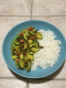 A rizst sóval és borssal kétszeres mennyiségű vízben felteszem főni. A hagymát kockázom és egy kevés kókuszzsíron megpárolom alacsony lángon, fedő alatt. Felaprítom a zöldségeket, mindent kisebb egyforma darabokra. Amikor a hagymának már kezd színe lenni, akkor tekerek rá frissen őrölt borsot, sót megszórom curryvel és kurkumával. Hagyom, hogy egy kicsit együtt párolódjanak. Ahogy megcsapja az orromat a curry finom illata, beleszórom az aprított paprikát. Körülbelül két percig párolom, öntök alá egy kis vizet, majd belezúdítom a gombát is. Megborsozom újra és jól összekeverem. Ahogy összeesnek a kis gomba darabok, mehet bele a cukkini is. Újra fűszerezem az egészet, keverek rajta néhányat és magas lángon pirítom, főzöm. Olyan 5 perc után beleöntöm a 2dl zabtejszínt és egy kis vizet. Jól felforralom és kóstolom, ha kell utána sózok.