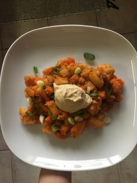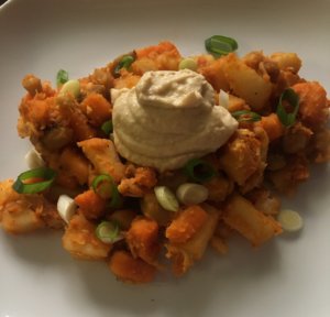 Egy tányérra szedem a burgonyás ételt, a tetejére teszek két-három evőkanál hummuszt (vagy avokádót), és két szelet pirítóssal megeszem. Szeleteltem rá újhagymát, mert nagyon szeretem. Nagyon jól illik hozzá a gyümölcs tea 🙂
