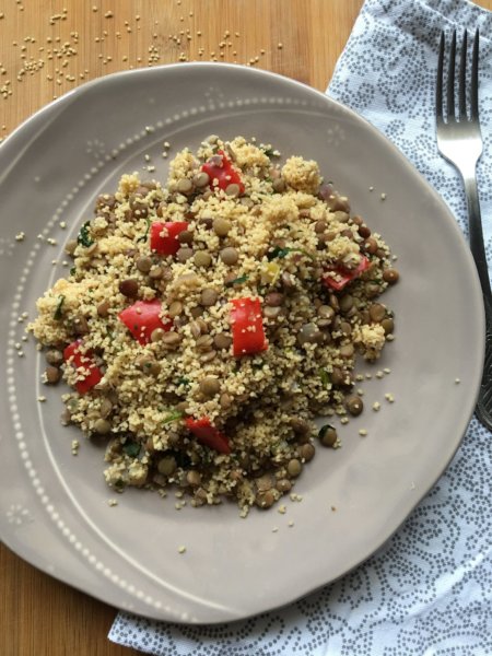 Addig is aprítsd fel a hagymákat a paprikát és a petrezselymet is. Egy mélyebb serpenyőbe önts egy kevés zöldségleves alaplevet tedd bele a lilahagymát, majd az újhagymákat és a fokhagymát is. Kezd el pároni, 2-3 perc múlva tedd bele a kockára aprított paprikát is. Öntsd még egy kis alaplevet rá, sózd, borsozd és tedd rá a fedőt. A lencsét szűrd le és ha a paprika megpuhult akkor keverd bele. Maradnia kell egy kis lének a serpenyőben, mert erre megy rá a száraz kuszkusz, keverd el, tedd vissza a fedőt és várj 5 percet. Majd keverd bele a petrezselymet és már eheted is.