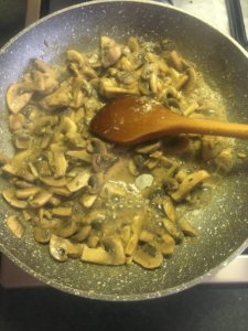 4.Közben vágd szeletekre a gombát és kb egy bögrényi zöldségleves alaplével egy serpenyőben párold meg. Tedd hozzá a kakukkfüvet, egy gerezd fokhagymát reszelve,sót, borsot, a miso pasztát és 2 evőkanál sörélesztőpelyhet. Keverd el alaposan.