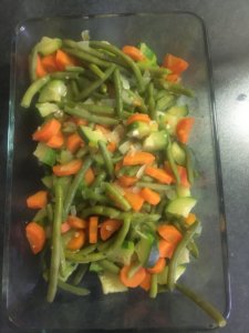 Szűrd le a párolt zöldségeket (3.lépés) és tedd át egy jénaiba vagy kerámia sütőtálba.