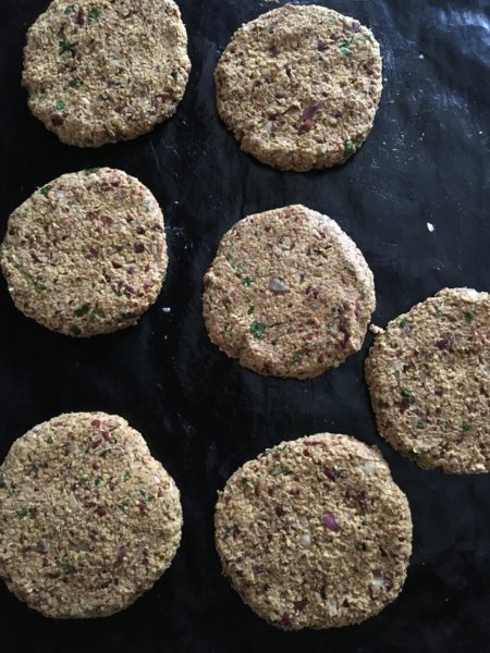 Egy turmixban, vagy nagyobb aprítóban pulzáló módban darabosra aprítom a zabpelyhet, diót és kurkumát. Majd nagyobb szeletekben hozzáteszem a lilahagymát, a lecsöpögtetett babot, gombát és lenmagot. Majd lassan, pulzáló módban összedarálom. Kell majd bele tenni egy kis vizet, hogy összeálljon. Két ujjad között ellenőrizd, hogy formázható-e már a massza. Ha túl száraz akkor önts hozzá még egy kis vizet, ha túl nedves akkor zabpelyhet tegyél még hozzá.
